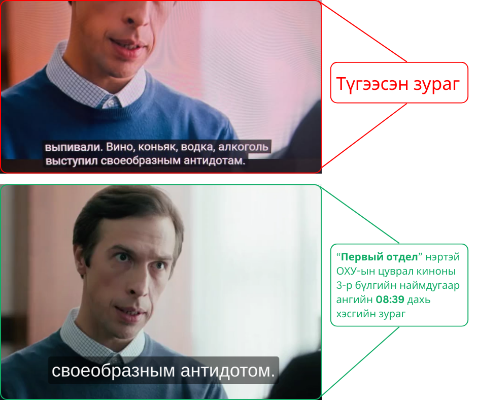 Тус ангийн 08 минут 39 дахь секундийн хэсэг нь түгээсэн зурагтай таарч байна. Цаашлаад 08 минут 25-40 секундийн хооронд гарах харилцан яриаг орчуулбал: